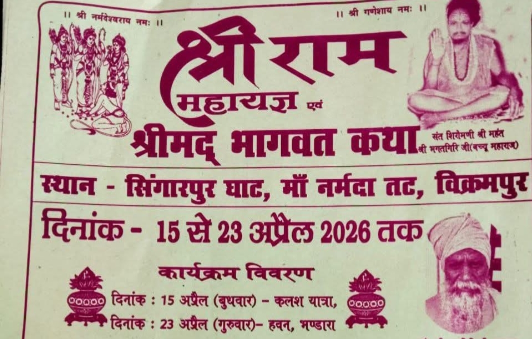 विक्रमपुर (डिण्डौरी)।माँ नर्मदा के पावन तट सिंगारपुर घाट, विक्रमपुर में आगामी 15 अप्रैल से 23 अप्रैल 2026 तक भव्य ‘श्री राम महायज्ञ एवं श्रीमद् भागवत कथा’ का आयोजन किया जा रहा है। गंगा सप्तमी के पावन पर्व पर आयोजित होने वाले इस धार्मिक अनुष्ठान में क्षेत्र के श्रद्धालुओं को भक्ति और अध्यात्म का अनूठा संगम देखने को मिलेगा। आयोजन समिति द्वारा जारी कार्यक्रम के अनुसार15 अप्रैल (बुधवार) को भव्य कलश यात्रा के साथ महोत्सव का शुभारंभ होगा।23 अप्रैल (गुरुवार) को हवन एवं विशाल भंडारे के साथ कार्यक्रम का समापन किया जाएगा।प्रवचन का समय प्रतिदिन प्रातः 08:00 बजे से दोपहर 12:00 बजे तक एवं दोपहर 03:00 बजे से शाम 06:00 बजे तक रहेगा। इस आयोजन में महान संतों और विद्वानों का सानिध्य प्राप्त होगा जिनमें संरक्षक संत शिरोमणि महंत भगतगिरि बच्चू महाराज जी एवं