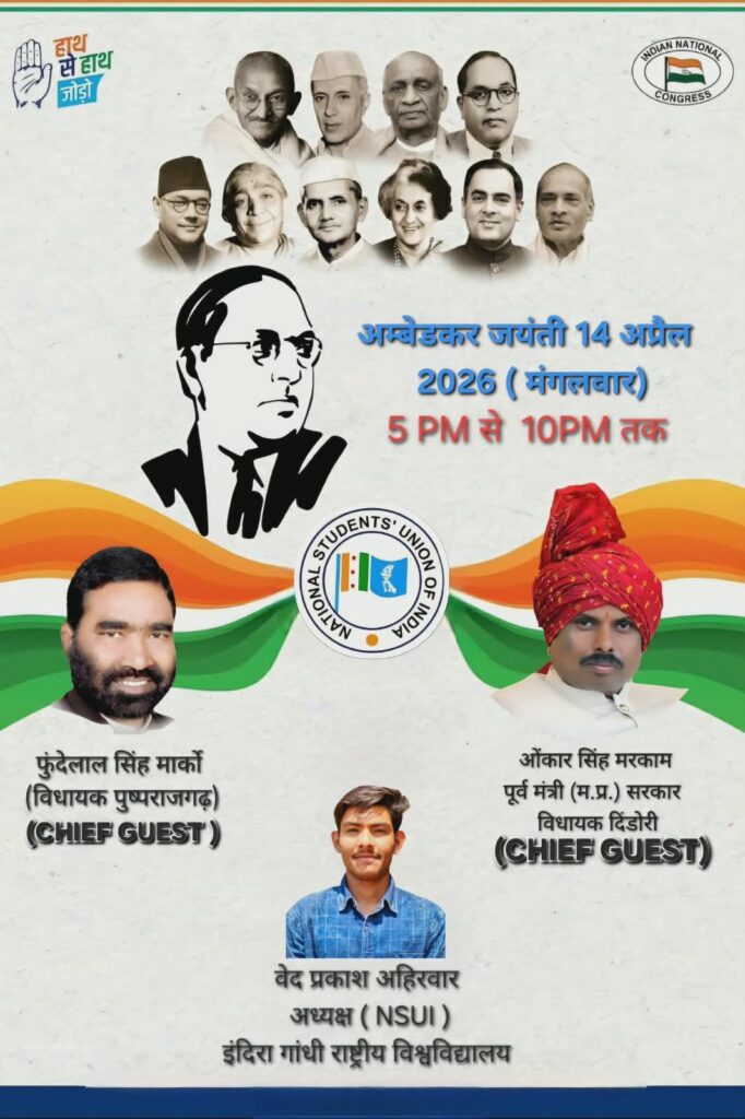 डिण्डौरी इंदिरा गांधी राष्ट्रिय विश्वविद्यालय अमरकंटक में बाबा भीमराव अंबेडकर की जंयती को धूमधाम से मनाया गया ,कार्यक्रम में मख्य अतिथि के रूप में फुंदेलाल सिंह मार्को विधायक पुष्पराजगढ व आंेमकार सिंह मरकाम विधायक डिण्डोरी मौजूद रहे कार्यक्रम का आयोजन वेद प्रकाश अहिरवार अध्यक्ष एनएसयूआई ने किया ,कार्यक्रम की शुरूआत ग्राम पोडकी से लालपुर तक विशाल शोभा यात्रा निकाली गई जिसमें बडी तादात में लोग व विश्वविद्यालय के छात्र छात्रा सम्मिलित हुए ,शोभा यात्रा जब विश्वविद्यालय पहुची तब आंबेडकर पार्क में रगारंग कार्यक्रम का आयोजन किया गया जिसमें विभिन्न प्रकार के कार्यक्रमो का आयोजन किया गया जिसमें जनजातिय लोक नृत्य ,भाषण ,गाना एवं सामूहिक न्रत्य शामिल रहा कार्यक्रम के अंत में भोज के बाद कार्यक्रम का समापन किया गया ।