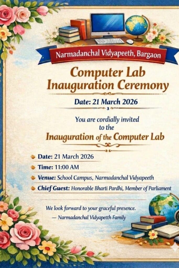 शहपुरा। प्रचार्य ने जानकारी देते हुये बतया की सीबीएससी बोर्ड नर्मदांचल विद्यापीठ बरगांव में शनिवार दिन सुबह 11 बजे होगा नवनिर्मित कंप्यूटर लैब का उद्घाटन सांसद भारती पारधी के द्वारा किया जावेगा जिसमे सभी लोग आमंत्रित है