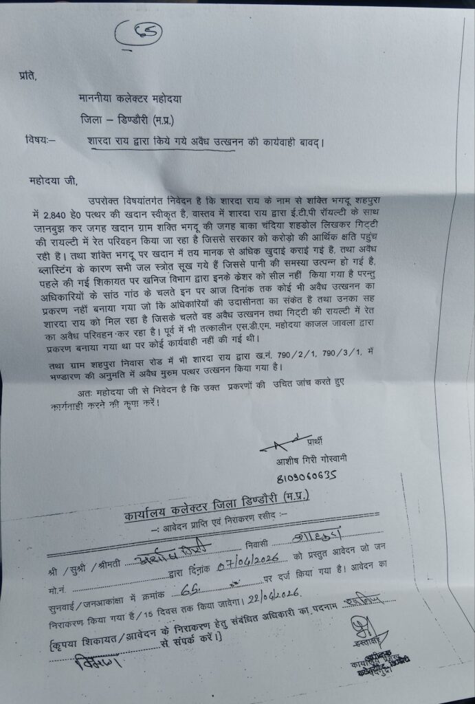 डिंडोरी। जनपद क्षेत्र शहपुरा अन्यर्गत शक्ति भगदू शहपुरा में शारदा राय के नाम से 2.840 हे0 पत्थर की खदान स्वीकृत है, वास्तव में शारदा राय द्वारा ई.टी.पी रॉयल्टी के साथ जानबुझ कर जगह खदान ग्राम शक्ति भगदू की जगह बाका चंदिया शहडोल लिखकर गिट्टी की रायल्टी में रेत परिवहन किया जा रहा है जिससे सरकार को करोड़ो की आर्थिक क्षति पहुंच रही है। तथा शक्ति भगदू पर खदान में तय मानक से अधिक खुदाई कराई गई है, तथा अवैध ब्लास्टिंग के कारण सभी जल स्त्रोत सूख गये हैं जिससे पानी की समस्या उत्पन्न हो गई है. पहले की गई शिकायत पर खनिज विभाग द्वारा इनके केशर को सील नहीं किया गया है परन्तु अधिकारियों के सांठ गांठ के चलते इन पर आज दिनांक तक कोई भी अवैध उत्खनन का प्रकरण नहीं बनाया गया जो कि अधिकारियों की उदासीनता का संकेत है तथा उनका सह शारदा राय को मिल रहा है जिसके चलते वह अवैध उत्खनन तथा गिट्टी की रायल्टी में रेत का अवैध परिवहन कर रहा है। पूर्व में भी तत्कालीन एस.डी.एम. महोदय काजल जावला द्वारा प्रकरण बनाया गया था पर कोई कार्यवाही नहीं की गई थी।