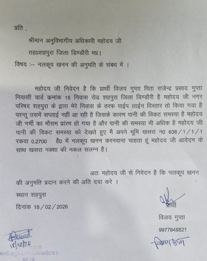 डिंडोरी। कलेक्टर डिण्डौरी के द्वारा पूरे जिले को जल अभाव ग्रस्त घोषित किया गया है जिसके तहत जुलाई तक किसी भी प्रकार के व्यक्तिगत बोर का खनन प्रतिबंधित है परन्तू आम आदमी को आवश्यक्तानुसार एसडीएम को आवेदन देने व उनकी स्वीक्रती के बाद बोर कराया जा सकता है ,इसी क्रम में पूरे तहसील से आम ग्रामीणो द्वारा एसडीएम कार्यालय शहपुरा में आवेदन दिया जाता है जिसके बाद एसडीएम शहपुरा कार्यालय से पीएचई आफिस शहपुरा उन आवेदनो को विभाग के अभिमत के लिए भेज दिया जाता है परन्तू विभाग के जिम्मेदार लापरवाही पूर्ण रवैया अपनाये हुए है उन आवेदनो पर महीनो गुजर जाने के बाद भी अपना अभिमत नहीं पहुचा रहे है जिस कारण आम ग्रामीण पीएचई विभाग के कार्यालय के चक्कर काटने को मजबूर है प्रसाशन से अनुरोध है कि विभाग पर कार्यवाही करते हुए आवेदको की समस्या का निदान करे ।
